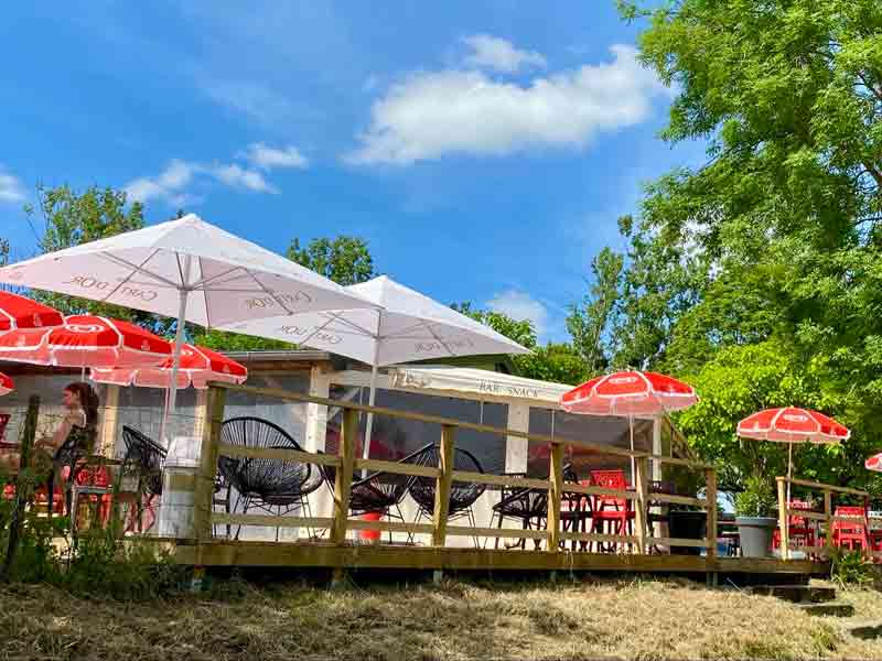 Notre camping dans la Sarthe vous propose, un snack/bar avec une terrasse face à la plage du lac de Brûlon.