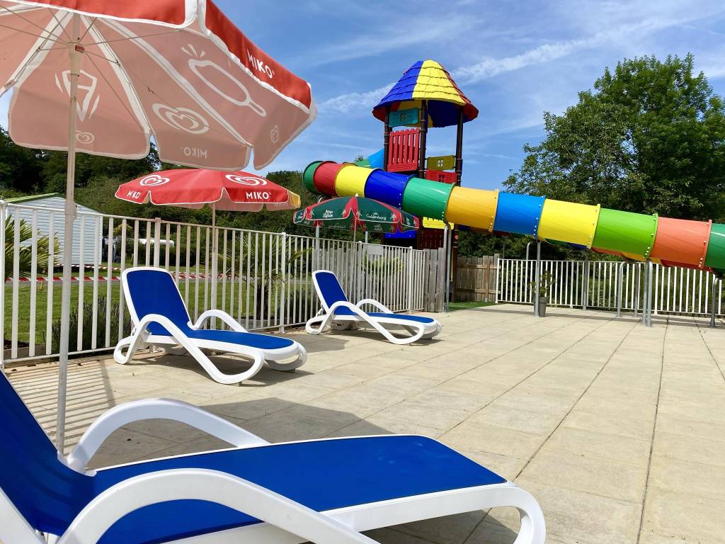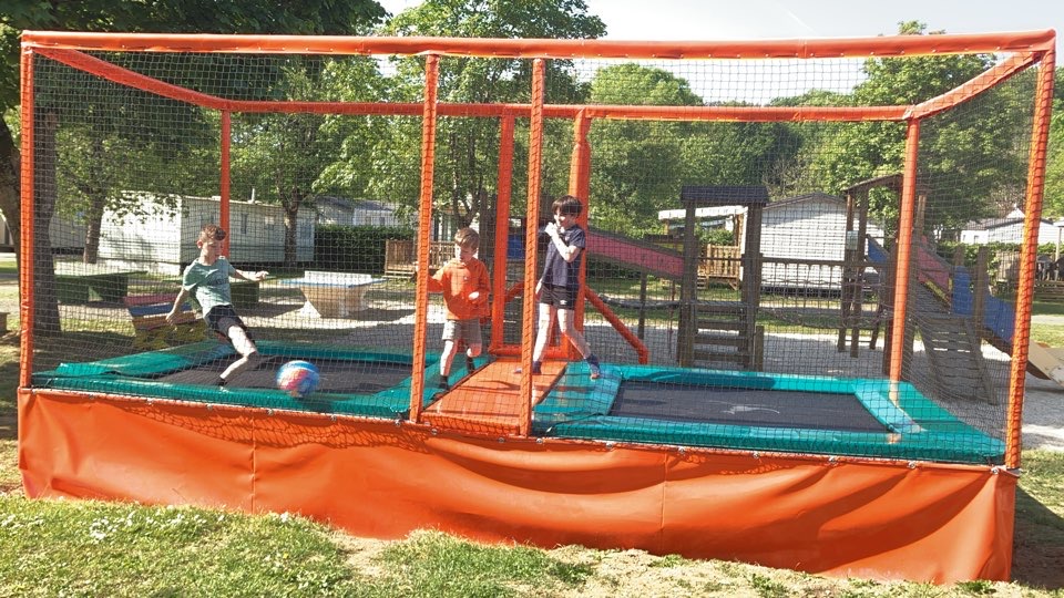 Une aire de jeux pour les enfants sous la surveillance des parents comprenant un espace jeux pour les plus petits, 2 trampolines pour petits et grands.