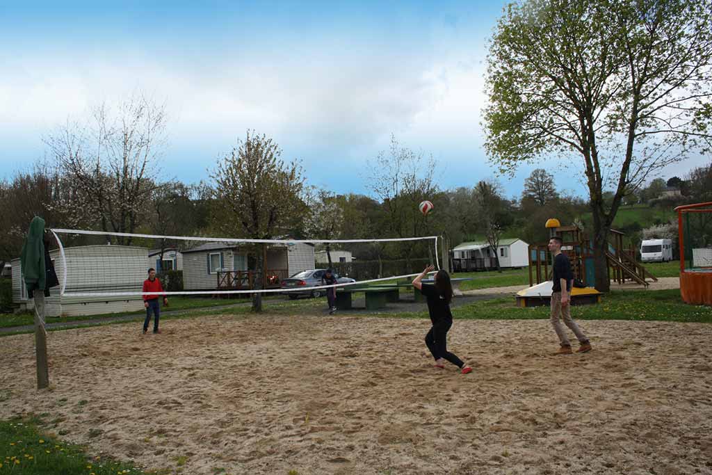 3 tables de tennis de table et un terrain de volley pour les sportifs.