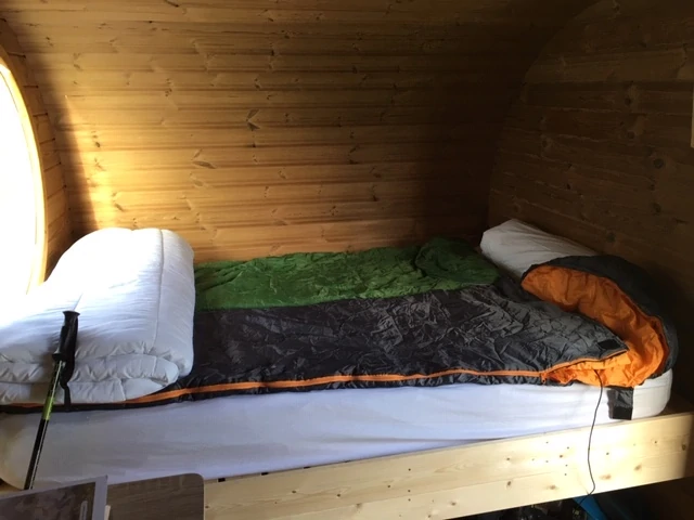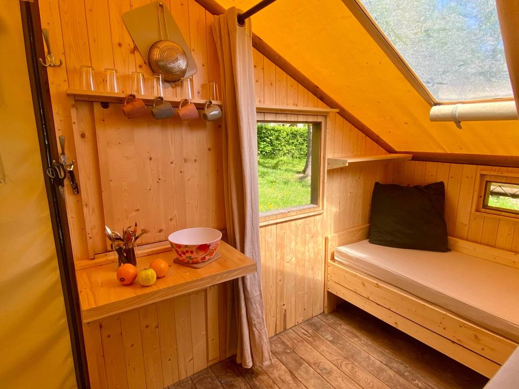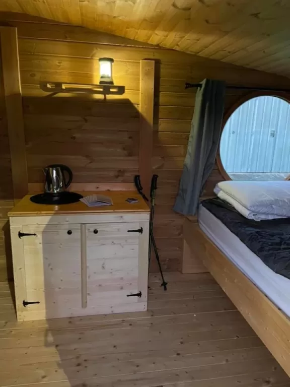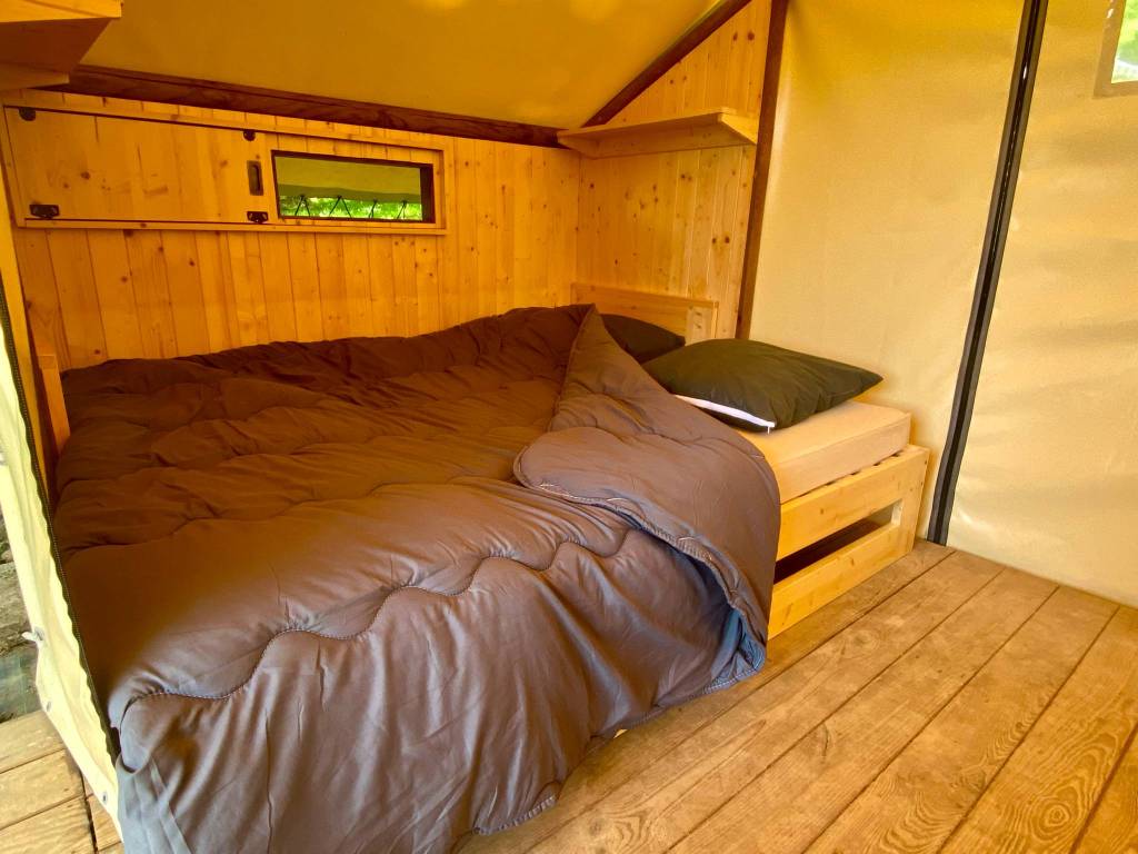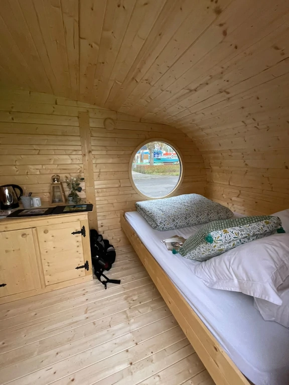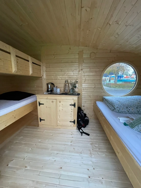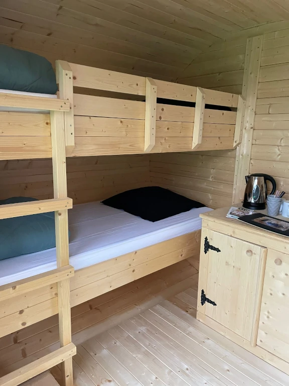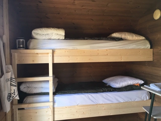 Cabane en bois insolite d'environ 10m², équipée d'une pièce comprenant 1 lit 2 couchage de 140cm, 2 lits superposés 1 couchage de 80 cm.